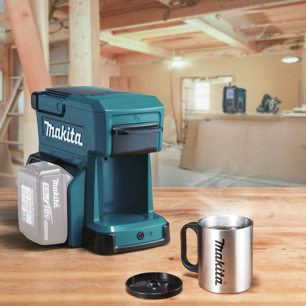 Get fresh brewed coffee wherever the job takes you with the 18V LXT / 12V max CXT Coffee Maker (DCM501Z, Tool Only). No paper filters are needed, just your favorite ground coffee, water, and a Makita 18V Lithium-Ion battery. It will brew up to three 5 ounce cups of coffee on a single charge of an 18V LXT 5.0 Ah battery (sold separately). It is also compatible with both Makita 12V max CXT and 18V LXT Lithium-Ion batteries.