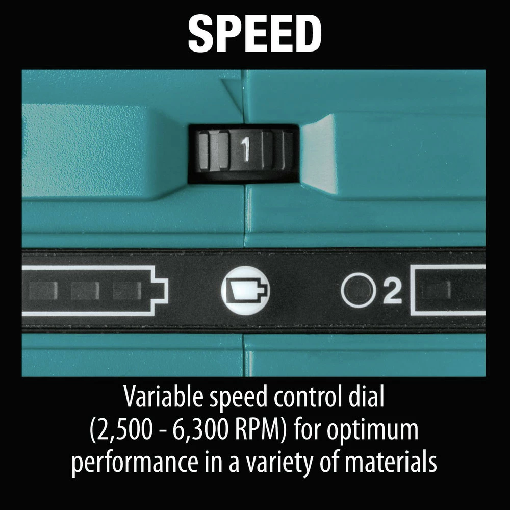 - Variable speed control dial (2500 – 6300 RPM) for optimum performance in a variety of materials