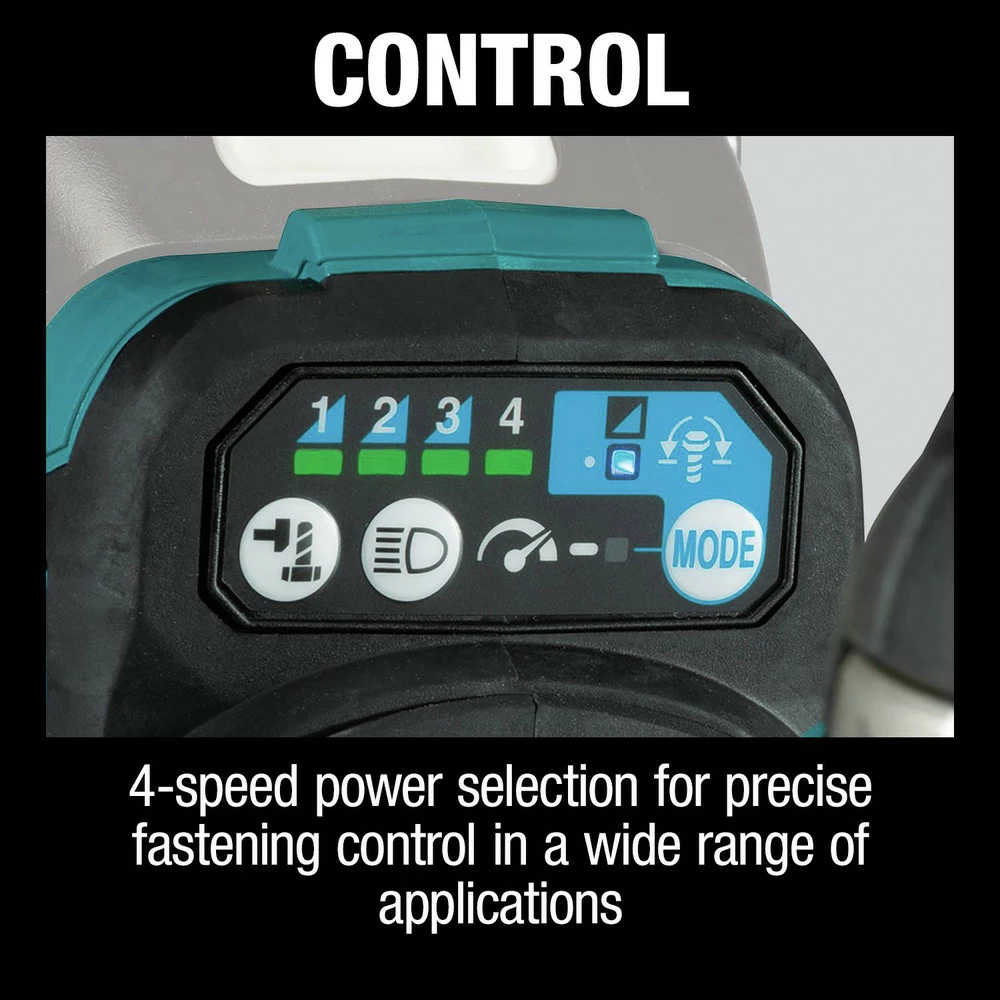 - 4-Speed power selection switch (0 – 500 / 0 – 1200 / 0 – 1900 / 0 – 2200 RPM and 0 – 1000 / 0 – 1700 / 0 – 2400 / 0 – 2700 IPM) for precise fastening control in a wide range of applications